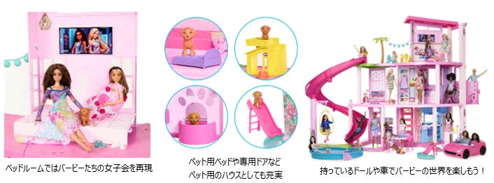 バービーが暮らすドリームハウスが新しくなりました。3階建てのらせん状のタイプで、10か所の屋内外のプレイエリアで360度遊ぶことができます。屋内にはキッチン、リビングルーム、ダイニングルーム、ベッドルーム、バスルーム、クローゼット、ボーナスルーム、屋外にはバルコニーやプールがあり、3階からスライダーで下りてくることができます。75種類以上の小物が含まれているので、様々な部屋で小物を使ったごっこ遊びが楽しめます。また、子犬も付いており、ペットエレベーター、ペットスライド、ペットプール、ペット用ベッド、各部屋へのペット用ドア、ペットハウスなどペット用の設備も充実しています。様々なシーンでの無限のごっこ遊びを通じて、お子さまの想像力を育てることで、想像力から将来の夢を描き、将来の“可能性"を広げるサポートをします。