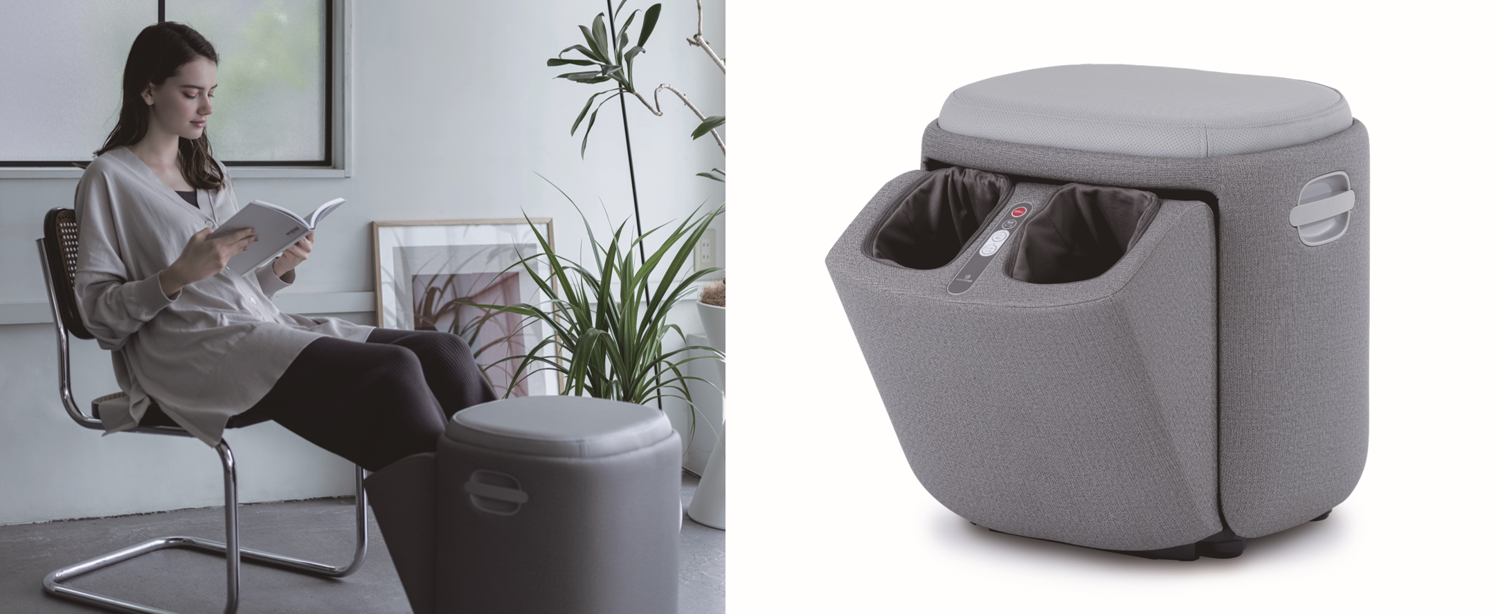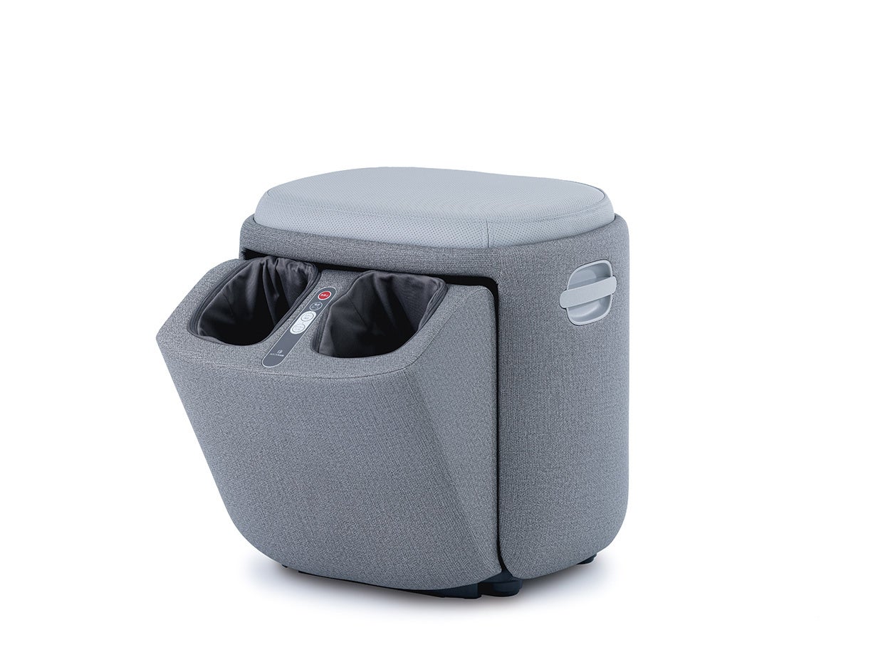 使わない時間はスツールやオットマンとして使用できるフットマッサージャー。エアバッグで膝下をまるごと包み込んでもみほぐしつつ、ローラータイプのもみ玉が足裏をマッサージします。