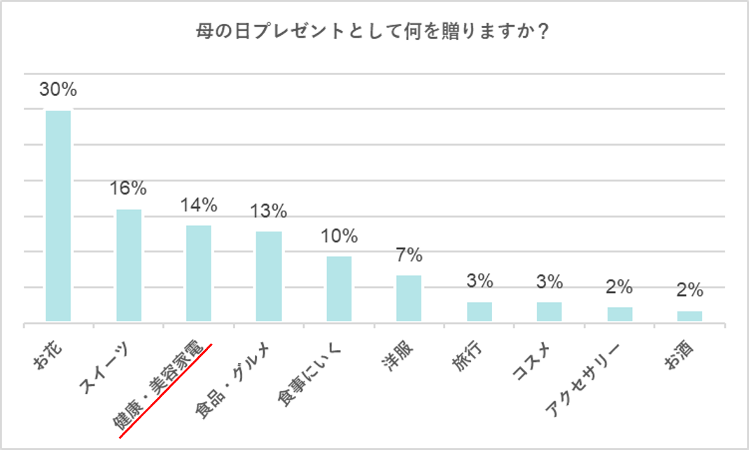 一方、〔母の日に何を送りますか?〕という質問に対しては、【健康・美容家電】が14%という結果となり、貰う側とあげる側で大きなギャップがあることが判明。