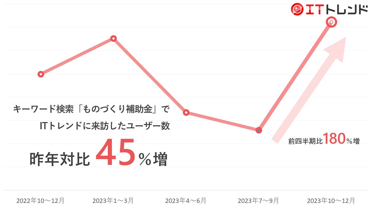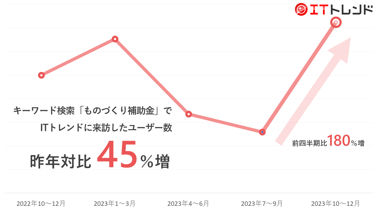 こうした各種補助金の申請の駆け込みに応じて補助金関連の検索キーワードでITトレンドにアクセスするユーザーの数は、前四半期に対して25%増加し、とくに「ものづくり補助金」を含む検索キーワードの場合約180%の増加、例年補助金に注目が集まる年末である昨年同四半期と比べても45%の増加となりました。