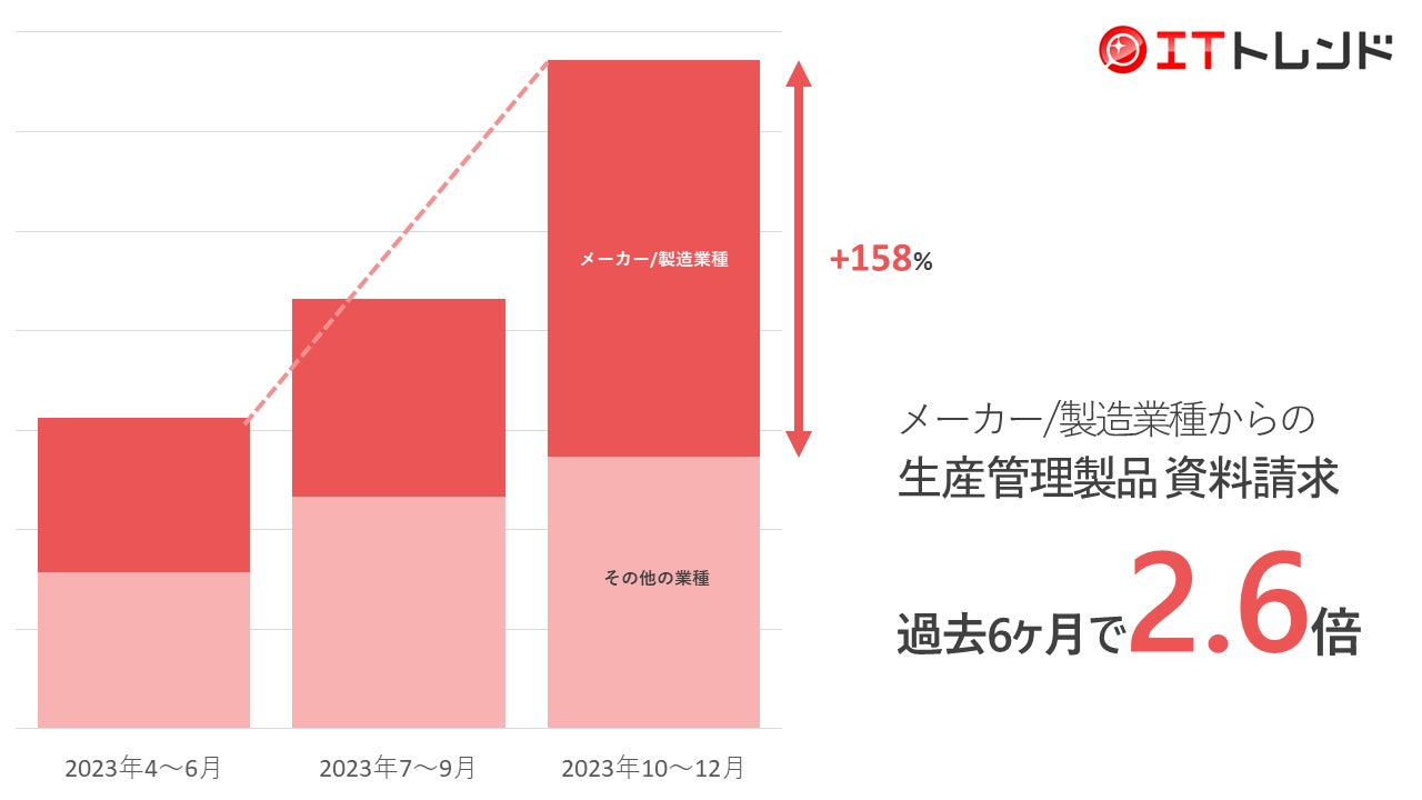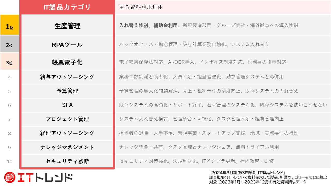 生産管理製品資料請求が過去6ヶ月で2倍に急上昇!最大8000万円助成の「ものづくり補助金」がIT基盤の導入を後押し!「2024年3月期 第3四半期 IT製品トレンド」を発表