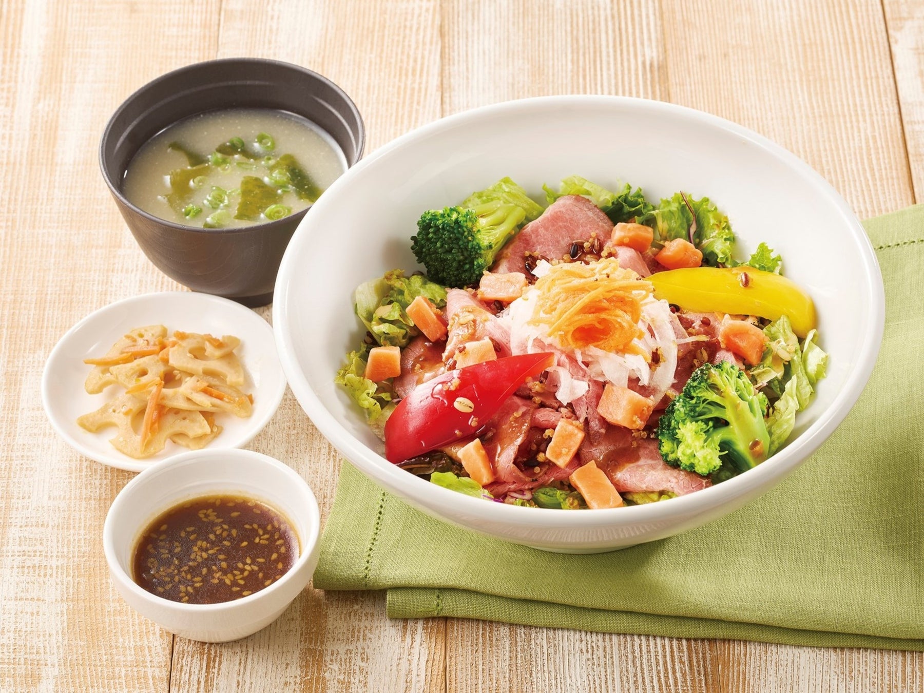 柔らかローストビーフ&サーモンの彩りサラダ丼(みそ汁・惣菜つき)