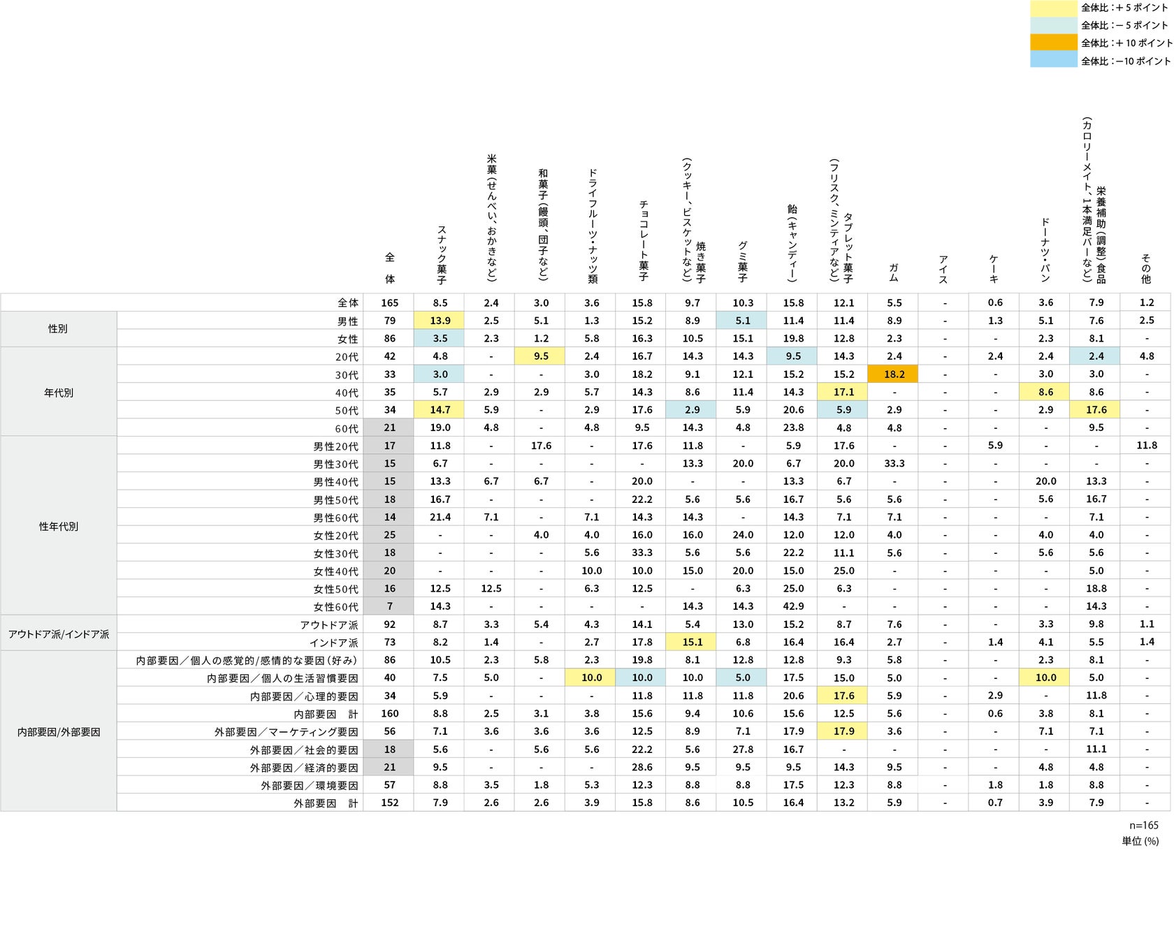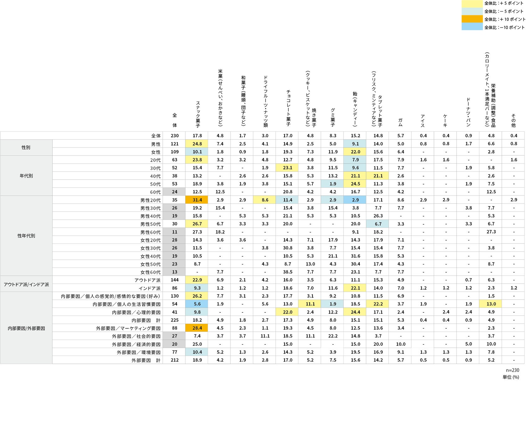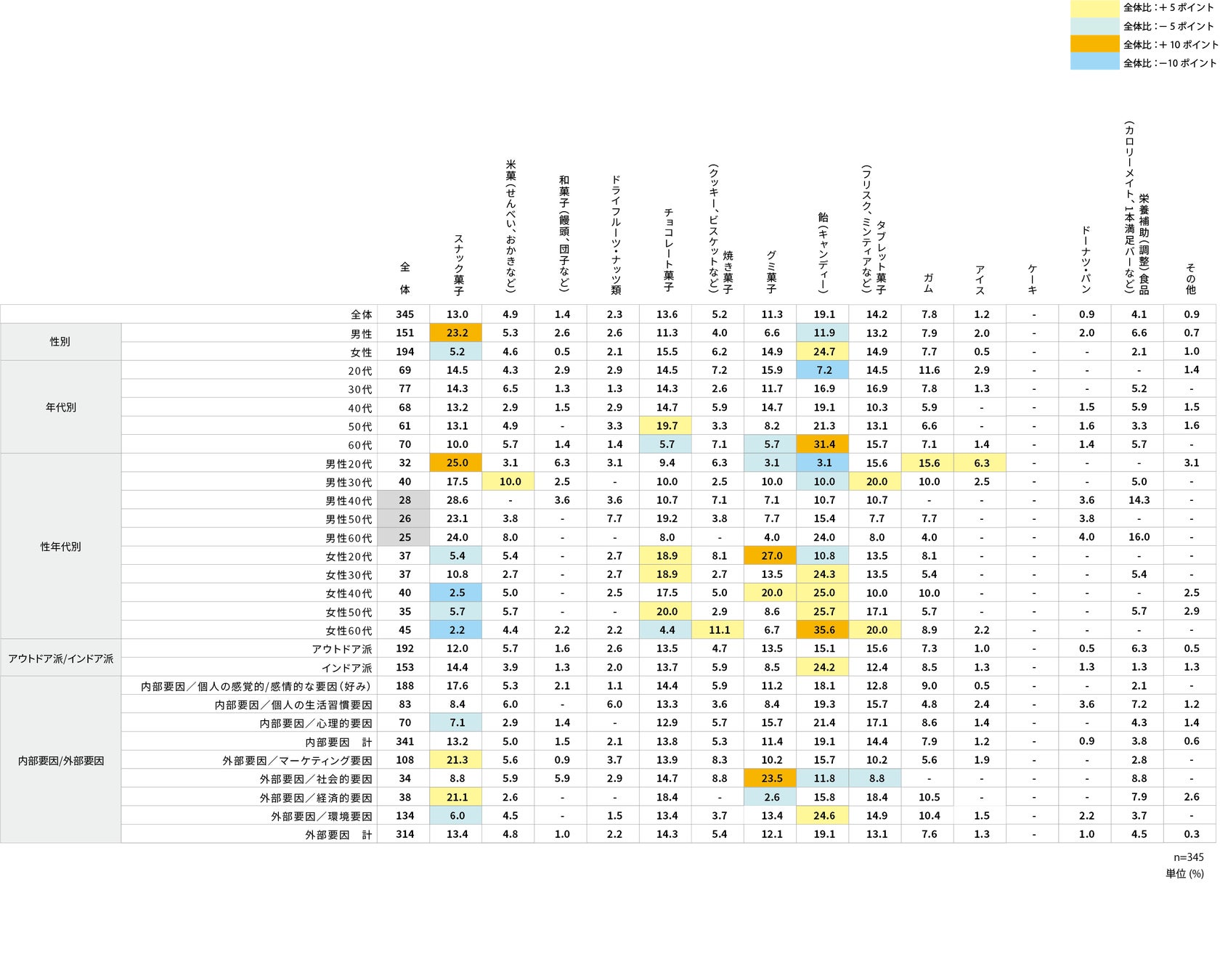 また、『アウトドア派/インドア派別』では、『全体』と比べ「飴」の『インドア派』で差があり、『全体』約19%のところ、『インドア派』は約24%と約5pt高かった。