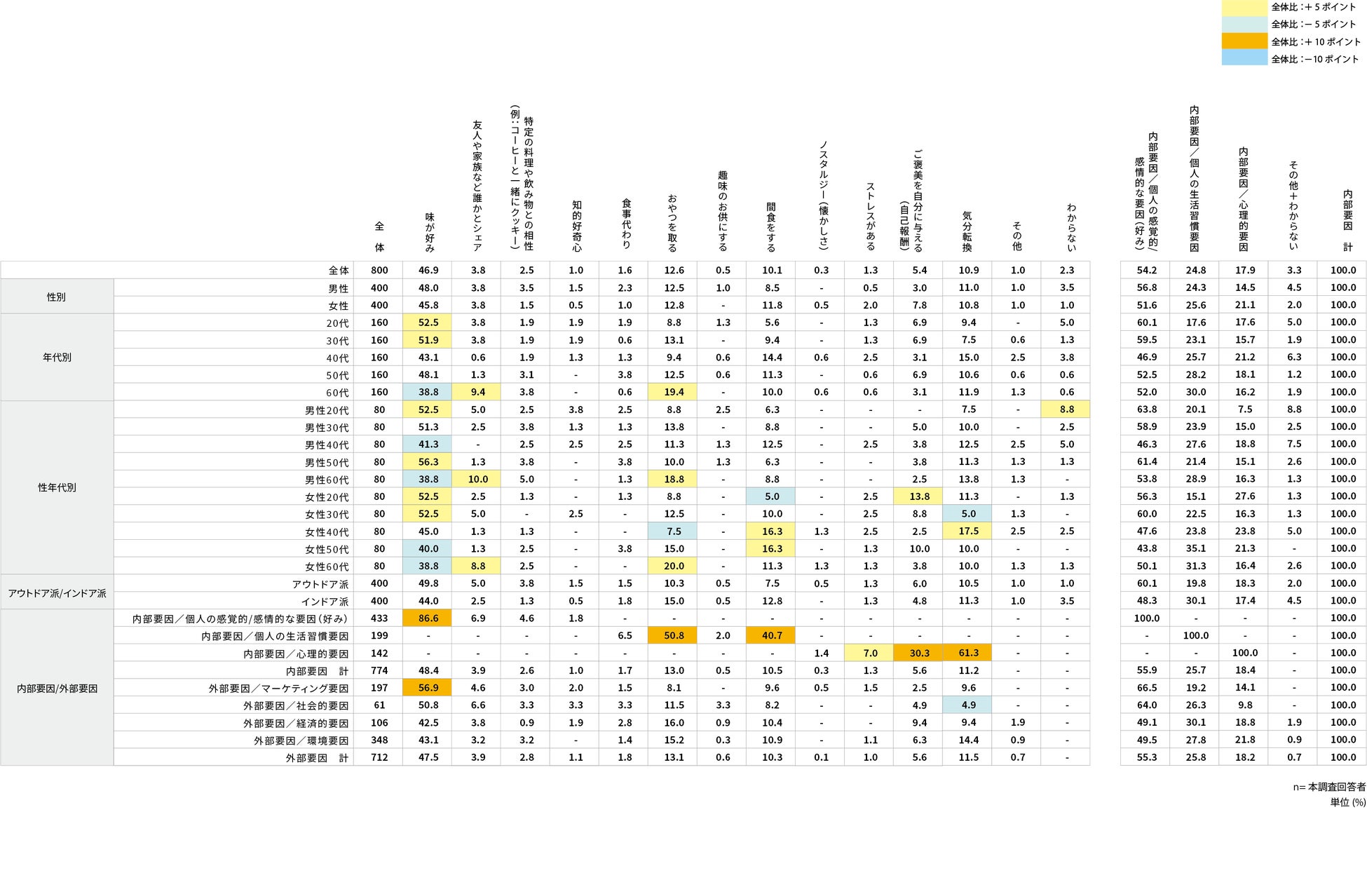『全体』では、TOP3は「味が好み(約85%)」、「おやつを取る(約51%)」、「間食をする(約51%)」となった。