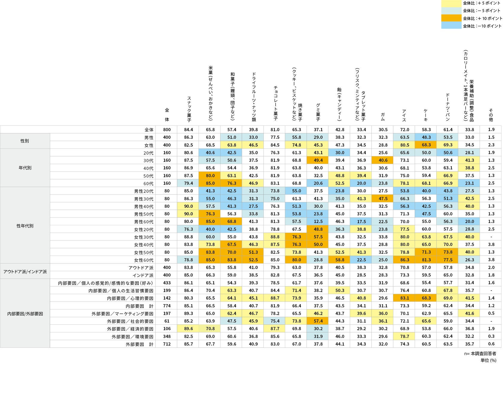 また、『アウトドア派/インドア派別』では、『全体』と比べたとき「焼き菓子」で差が見られ、『インドア派』が約5pt高かった。