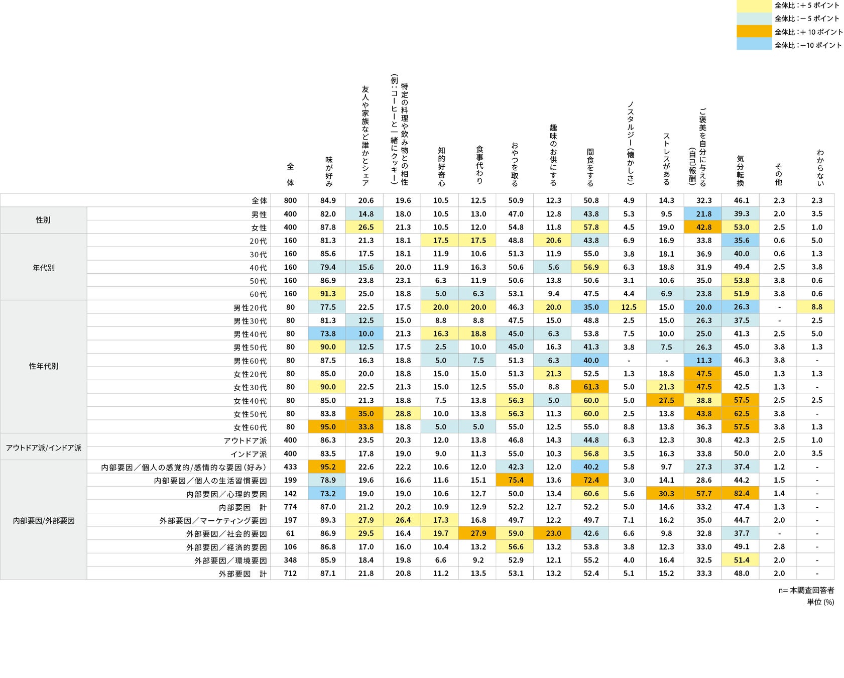 性別で見た時、『全体』と比べると「友人や家族など誰かとシェア」、「間食をする」、「ご褒美を自分に与える」、「気分転換」で差が出た。特に「ご褒美を自分に与える」では男性が約11pt低く、『女性』の方が約11pt高かった。