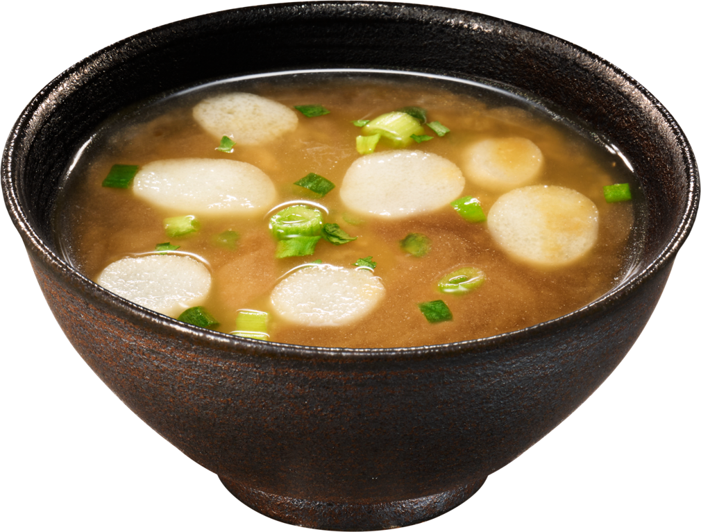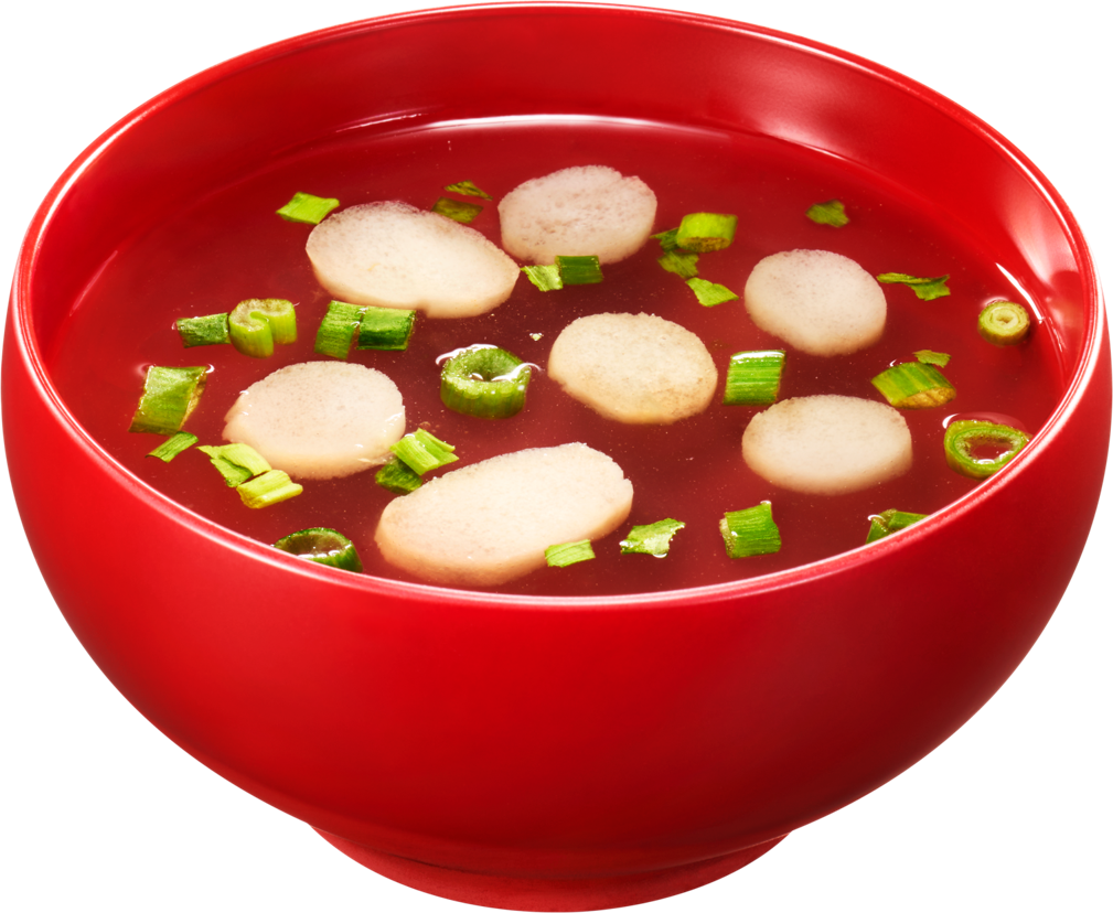 鰹、昆布、焼あごの3つのだしを重ねたお吸いもの。かつお削り節を入れ、「目に見えるだし」の存在感で本格的なだしの味わいを実現しました。
