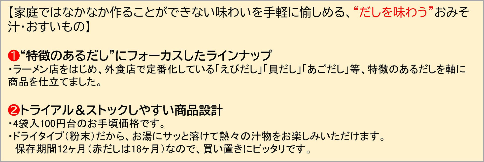 「赤だし(みそ汁)」は、1967年の発売から数えて今年で59年目を迎える粉末みそ汁のパイオニア商品です。(※あさげ発売は1974年)
