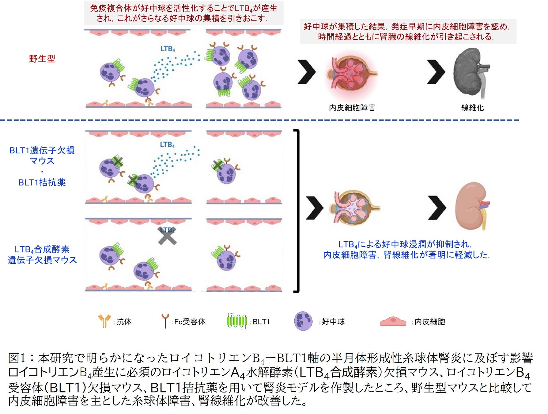 以上の結果から、免疫複合体が好中球を刺激することでロイコトリエンB4が産生されて好中球を糸球体に誘導し、それが引き金になって糸球体障害が生じて急性腎炎が発症すること、このロイコトリエンB4産生を抑えたり、BLT1拮抗薬を投与することで、半月体形成性糸球体腎炎の予防や治療につながる可能性があることが示されました。