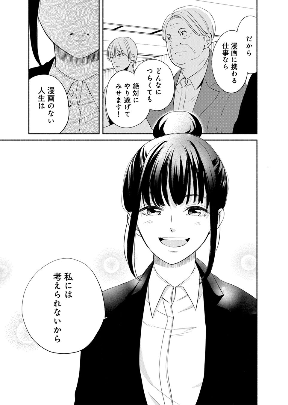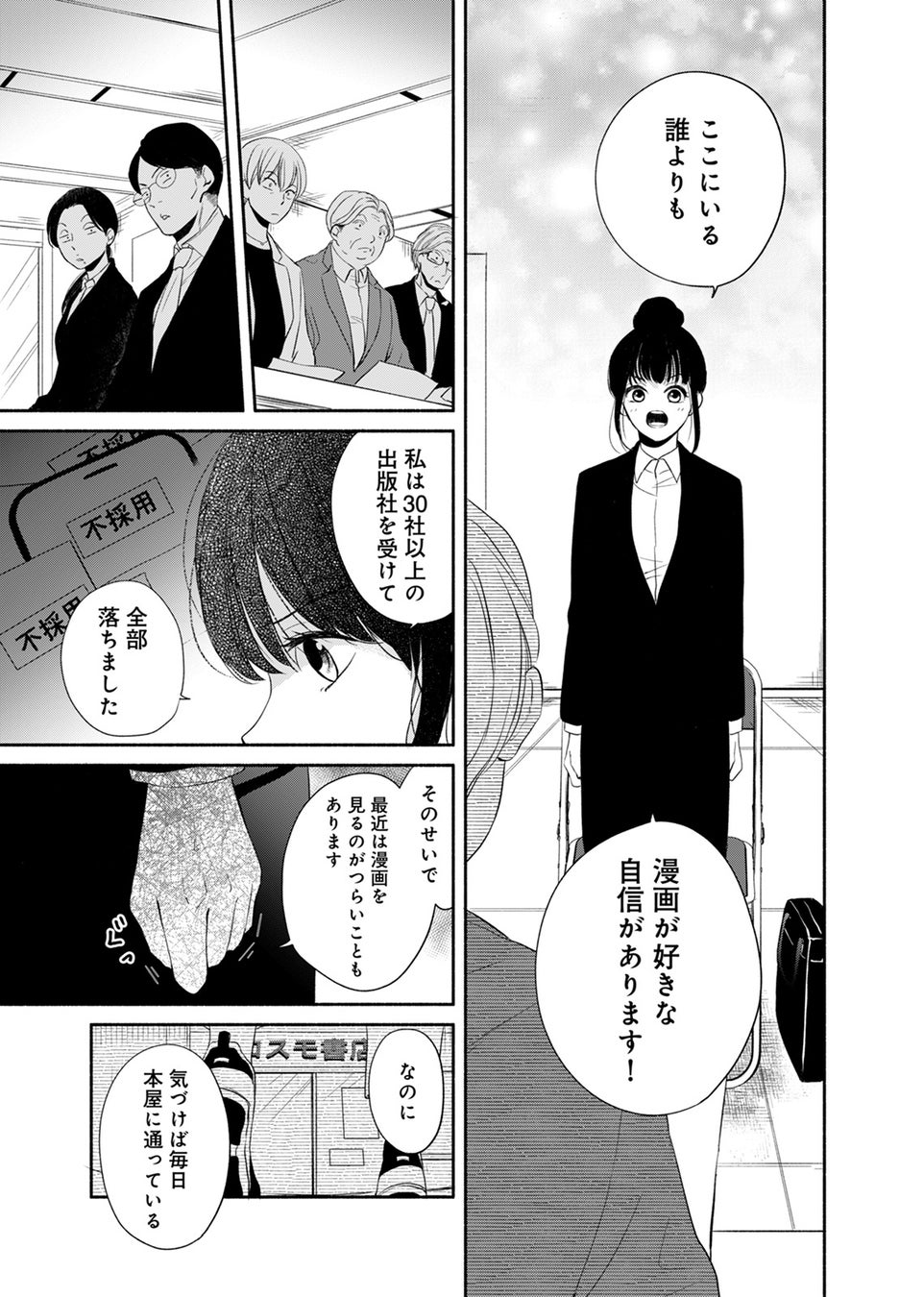 漫画好きの就活生・双葉栞は、憧れの大手紙出版社・光栄館の漫画編集者になることを目指し面接に挑むも、社長から「君は読者のままでいたほうがいい」と告げられ不採用に。