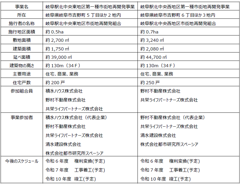 積水ハウス株式会社(本社:大阪市北区/代表取締役 社長執行役員 兼 CEO:仲井 嘉浩、以下「積水ハウス」)・野村不動産株式会社(本社:東京都新宿区/代表取締役社長:松尾 大作 以下「野村不動産」)・共栄ライフパートナーズ株式会社(本社:岐阜県岐阜市/取締役社長:水野 友範、以下「共栄ライフパートナーズ」)は、「岐阜駅北中央東地区第一種市街地再開発事業」、野村不動産・共栄ライフパートナーズは「岐阜駅北中央西地区第一種市街地再開発事業」 の事業参加者として権利者の皆様と事業推進して参りましたが、両事業は2023年2月24日に市街地再開発組合設立について、それぞれ岐阜県知事の認可を受け、正式に参加組合員として事業に参画することとなりましたのでお知らせいたします。
