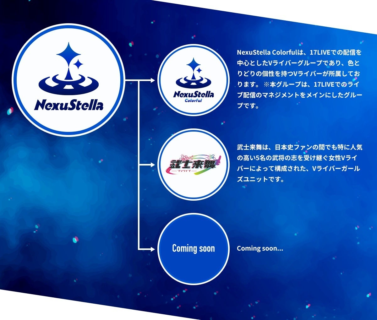 「NexuStella」は、「新しい輝き」で感動を届けるVライバープロダクションです。1つ1つの星(=Stella)が夜空を彩るように、タレントやファン、そしてクリエイターも輝き、繋がる(=Nexus)ことで最高の景色を繋いでいく。そんな世界を目指してまいります。コンセプトや方針によってユニットが分かれており、Vライバーガールズユニット「武士来舞」や「NexuStella Colorful」といったユニットが傘下として活動中です。