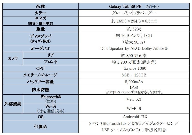 <主な仕様 :「Galaxy Tab S9 FE」>