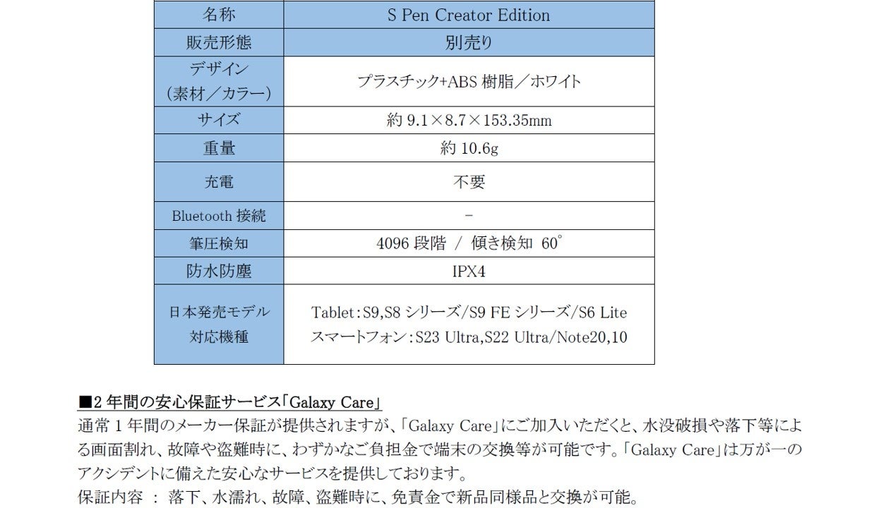 なお、「Galaxy Tab S9 FE」をご使用の方におすすめの「S Pen Creator Edition」も本日2023年10月12日(木)より予約受付を開始し、2023年10月19日(木)より販売開始いたします。