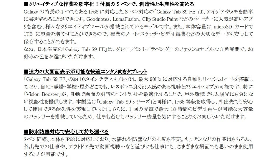 「Galaxy Tab S9 FE」の特長は、以下のとおりです。