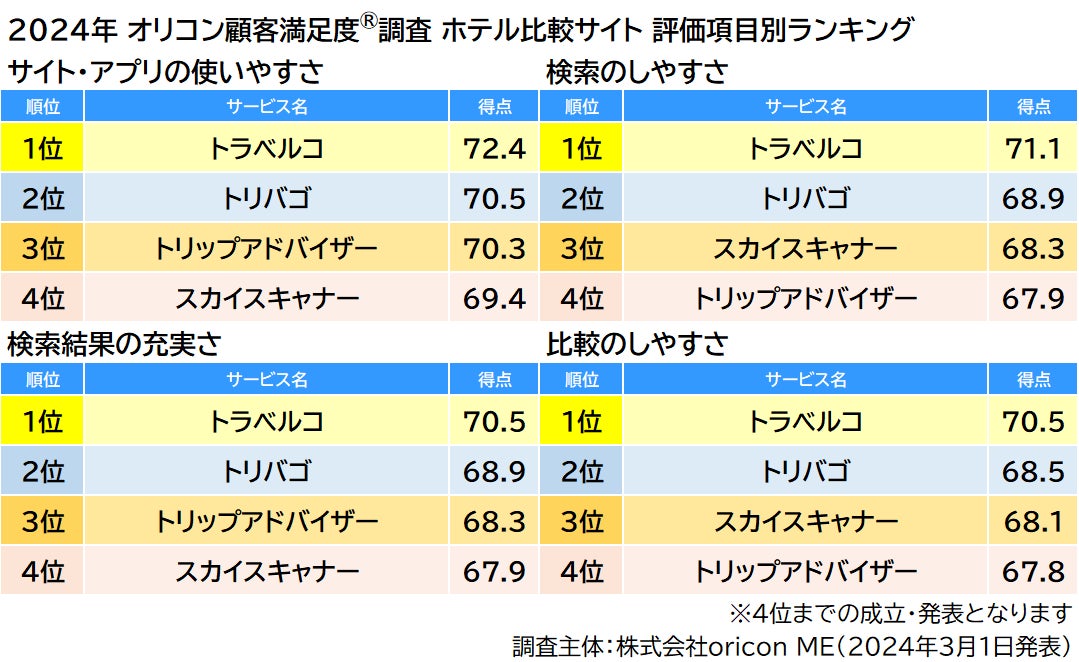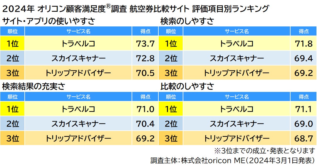 「サイト・アプリの使いやすさ」「検索のしやすさ」「検索結果の充実さ」「比較のしやすさ」の全4つの評価項目別ランキングでは、【トラベルコ】にとって初の全評価項目1位を記録しました。