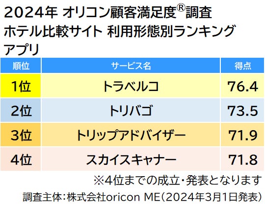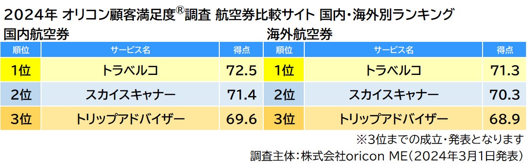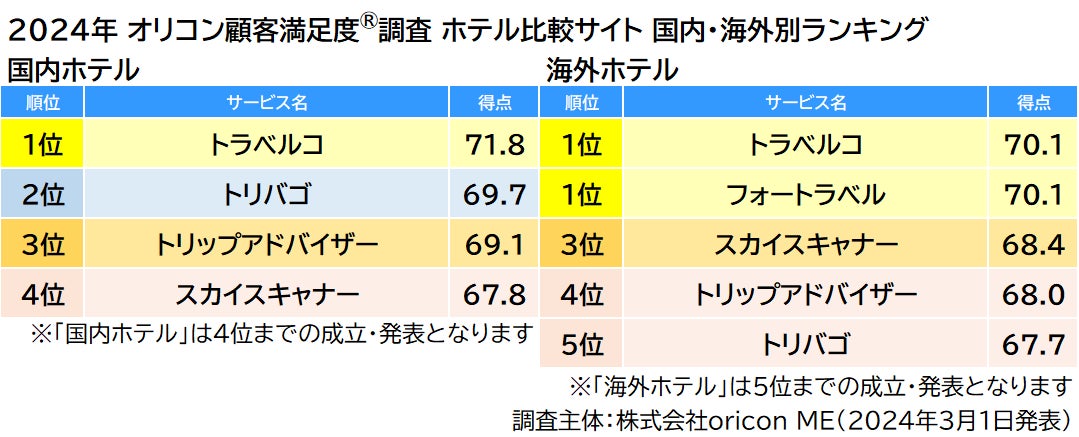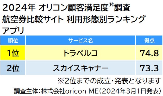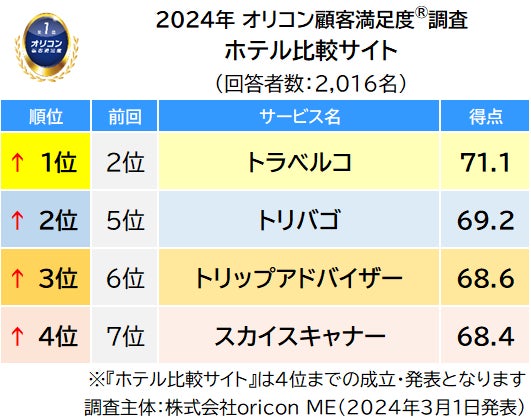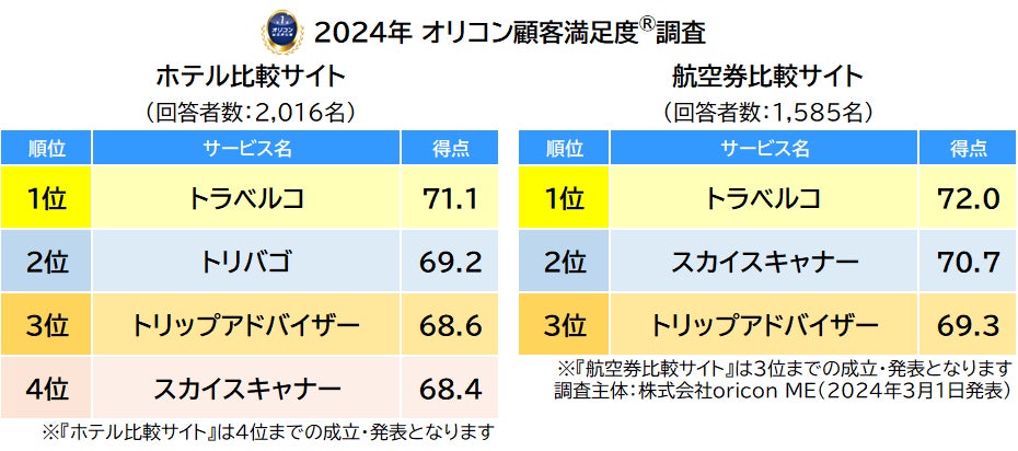 2024年 満足度の高い『ホテル比較サイト』『航空券比較サイト』ランキング ホテル・航空券ともに【トラベルコ】が評価項目・部門すべて1位を獲得し4度目の総合1位(オリコン顧客満足度®調査)