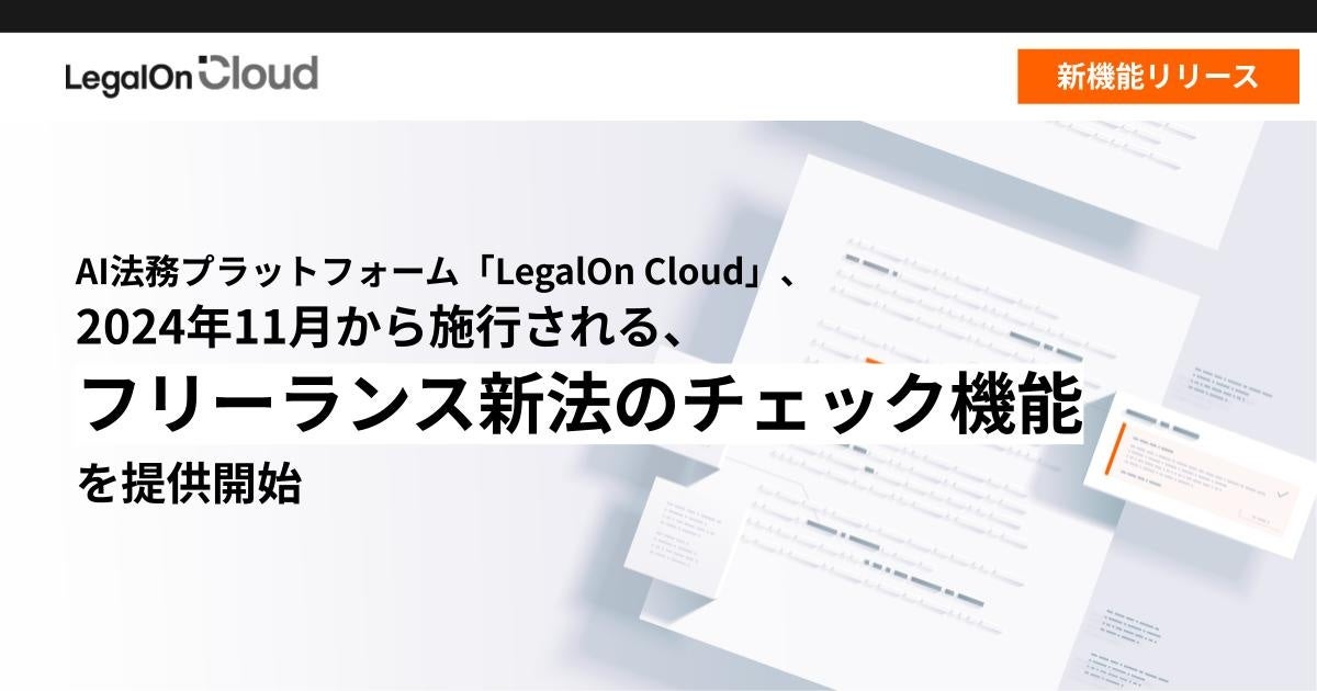 株式会社LegalOn Technologies(本社:東京都渋谷区 代表取締役 執行役員・CEO:角田 望)は、AI法務プラットフォーム「LegalOn Cloud」(https://www.legalon-cloud.com/ )にて、2024年11月から施行される、フリーランス法チェック機能「法令遵守チェック(フリーランス法)」を提供開始しました。これにより、フリーランス新法に対応した契約書の作成、審査にかかる労力を軽減します。