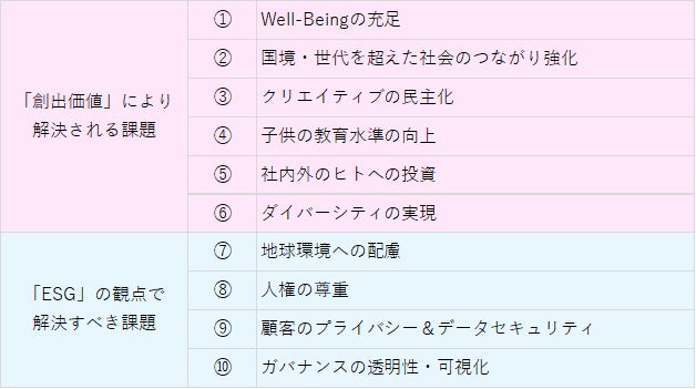 向こう十年を見据えた当社を取り巻く事業環境分析をおこない、政治・社会・経済、エンターテイメント市場のマクロトレンドなどの観点から幅広くテーマを抽出しました。当社の事業を通じて、「心を癒し人と環境に寄り添う」「生活に楽しみを増やす」「人と人をつなげる」「自己表現を後押しする」「エンターテイメントの力で社会課題を解決する(教育等)」等の社会的価値を創出し課題の解決に努めます。