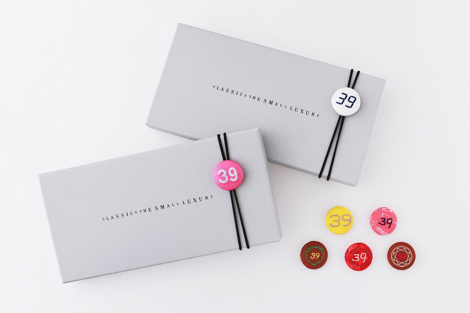 くるみボタンには、感謝の気持ちを込めた数字「39(サンキュー)」や「Merci」の刺繍をあしらいました。ハンカチーフコンシェルジュが、ハンカチーフのデザインを最大限に活かしながら、それぞれに合う刺繍フォントを組み合わせ、手仕事で丁寧に仕立てたオリジナルアイテムです。これまで支えてくださった皆さまへの感謝をかたちにした、ささやかな記念品です。
