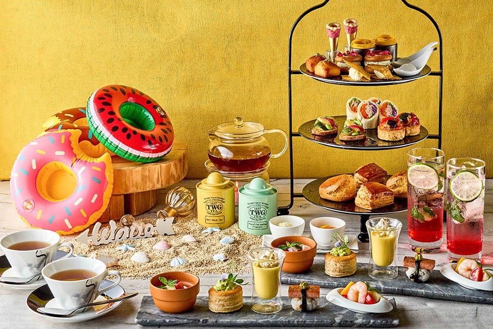 今回は、夏が旬のフルーツや食材を使い、暑い夏を存分に味わえるアフタヌーンティーをご用意します。プティフールでは、豊かな香りと甘みが特徴のアップルマンゴーを使ったショートケーキやフランボワーズとマスカルポーネの甘酸っぱいミルキーなクリームをパインチップでサンドしたクリームサンド、ライチの華やかな香りが口いっぱいに広がるひと口サイズのゼリーなどが楽しめます。また、毎回好評のシーズンスコーンは、パイナップルスコーンをご用意。ライムを効かせたさっぱりとした味わいのマンゴージャムと合わせると南国気分が味わえます。セイボリーでは、トリュフポップコーンのアクセントを効かせたトウモロコシのスープや見た目にも鮮やかな夏野菜と相性抜群の枝豆のフムスのカナッペ、コロンとした見た目も可愛いスパムおむすびなどが並びます。彩り鮮やかな夏らしいスイーツや料理の数々を「TWG Tea」とともに、洗練された上質な空間でお楽しみください。