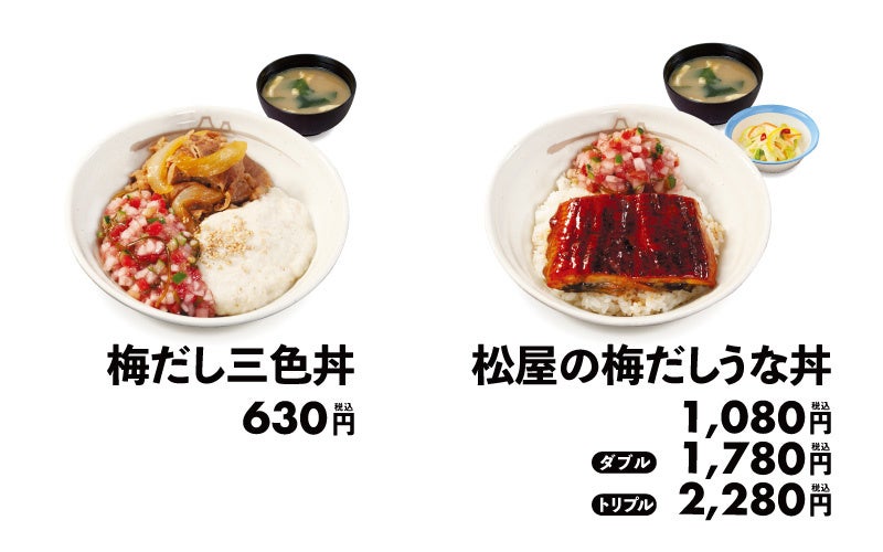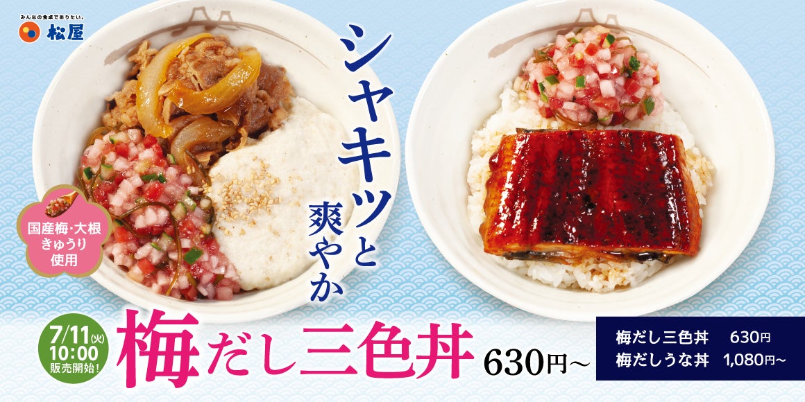 このたび松屋フーズ(本社:東京都武蔵野市、代表取締役社長:瓦葺一利)では、牛めし・カレー・定食・その他丼の「松屋」におきまして、2023年7月11日(火)午前10時より「梅だし三色丼」「松屋の梅だしうな丼」を発売いたします。