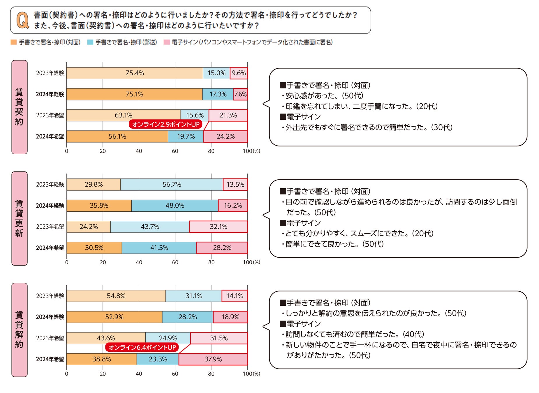 賃貸更新・解約における書類のやり取りは、オンライン経験者が増加。購入・賃貸契約・解約で、「電子サイン」を希望する傾向
