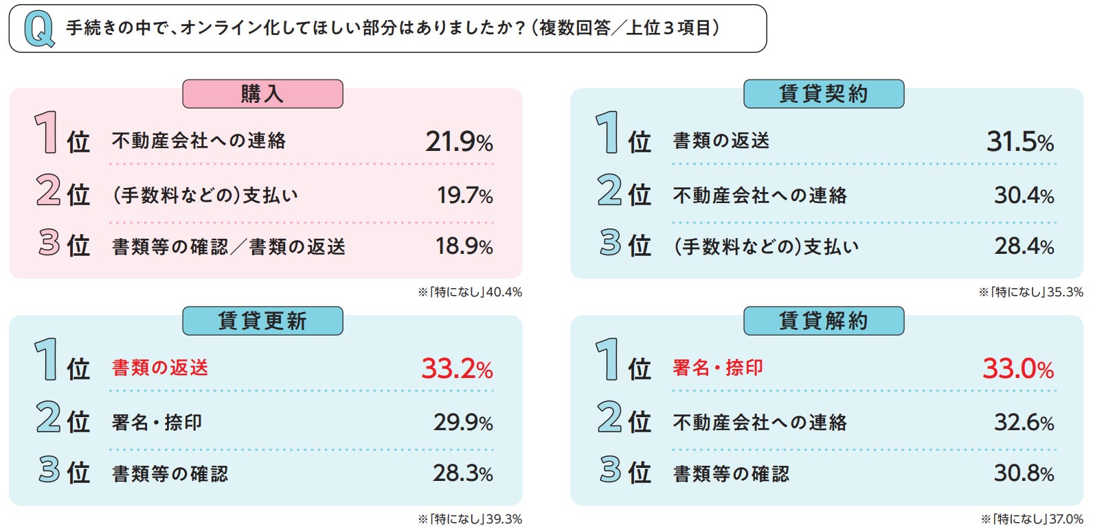 手続きの中でオンライン化してほしい部分を聞いたところ、賃貸更新における「書類の返送」が33.2%と、全体を通してトップでした。次いで、賃貸解約における「署名・捺印」が33.0%でした。賃貸解約では、トップ3全て3割を超えており、オンライン化を求める消費者が多いことが分かりました。