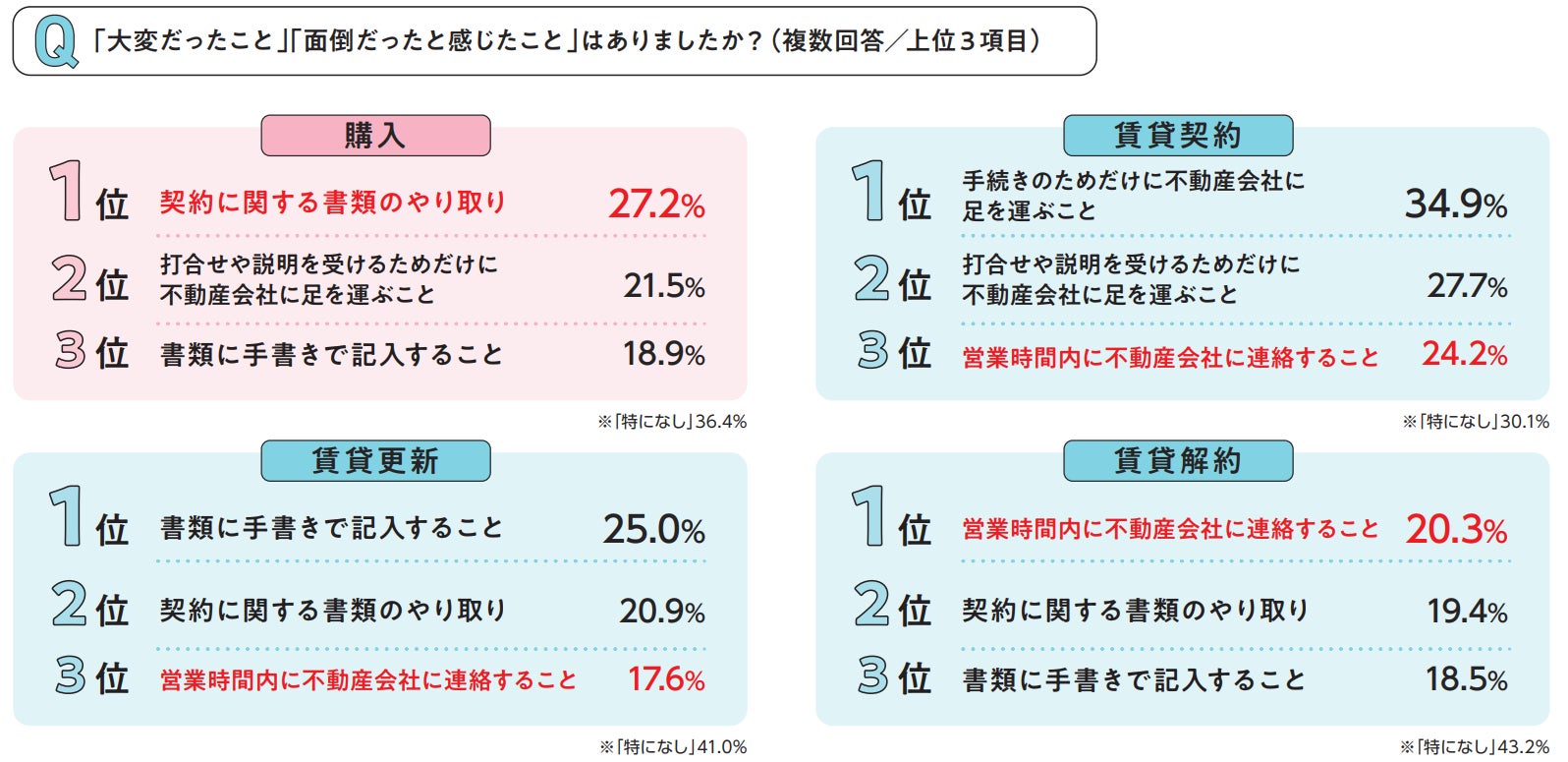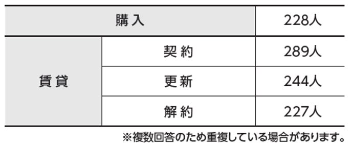 「大変だったこと」「面倒だったと感じたこと」は、購入では「契約に関する書類のやり取り」がトップでした。賃貸契約・更新・解約の全てで、「営業時間内に不動産会社に連絡すること」がトップ3にランクインしています。特に賃貸では、営業時間内に不動産会社に連絡することが大変、と感じる人が多いようです。