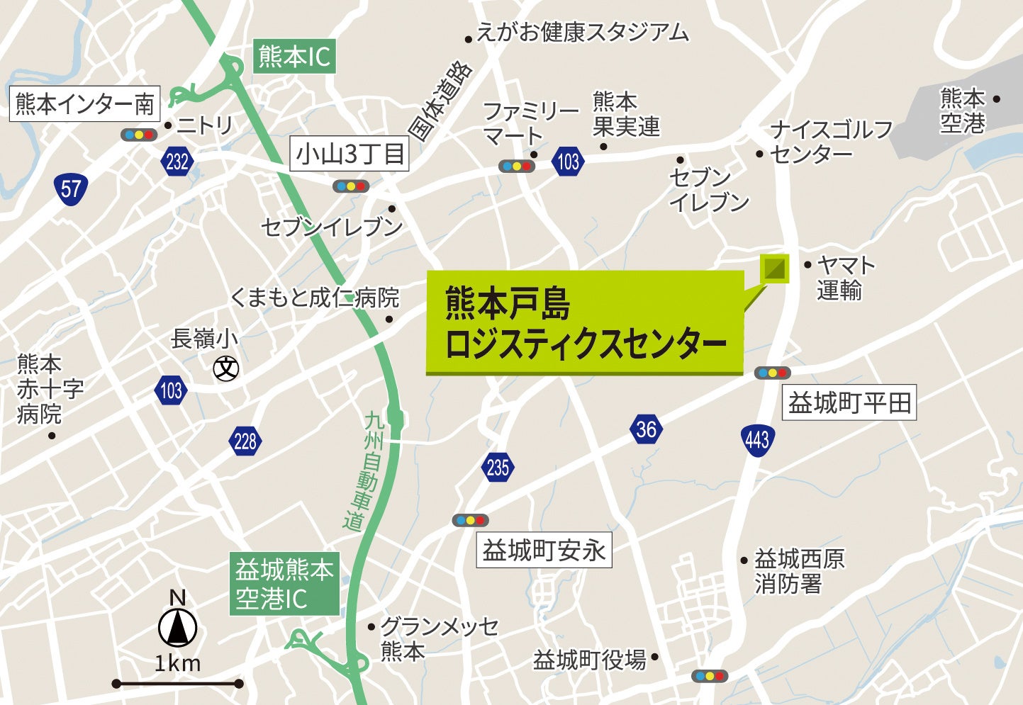 当該地は、九州で3番目に人口の多い熊本市の中心部から東へ約10kmの場所に位置し、九州地方の南北を結ぶ九州縦貫自動車道「益城熊本空港IC」から約5.5km、「熊本IC」から約8.8kmと交通利便性の高い場所に位置しています。また、半導体関連工場の集積地である菊陽町・大津町・合志市にも近接しており、物流施設の立地として高いポテンシャルを有しています。