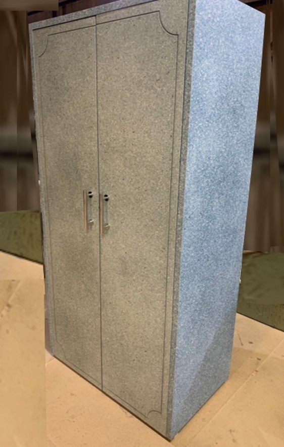 ワードローブは、原材料となる作業着と牛乳パックをそれぞれ粉砕し、DNPの工場廃紙を粉砕したものと混ぜ合わせ、圧縮・成形して作成しています。サイズは幅900×高さ1800×奥行き550mmで、20kg程度の衣服が収納できます。従来から提供している繊維リサイクルボードと同等の強度があります。