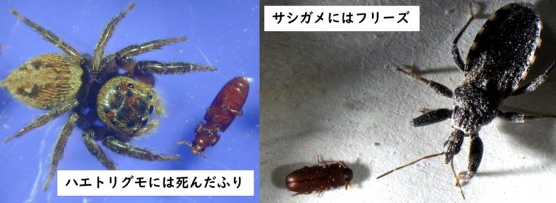 これまでの研究でも本種は、追撃型の天敵であるハエトリグモに襲われるとフリーズせずすぐに死んだふりをすることが明らかにされていましたが、今回の研究では待ち伏せ型の天敵であるコメグラサシガメを与えたところ、死んだふり行動はまったく見られず、フリーズして天敵をやり過ごす戦術に徹底しました。つまり体長5ミリにも満たないこの微小甲虫は、攻撃してくる敵のタイプによって、フリーズするか、死んだふりをするのかを使い分けることが世界で初めて明らかとなりました。