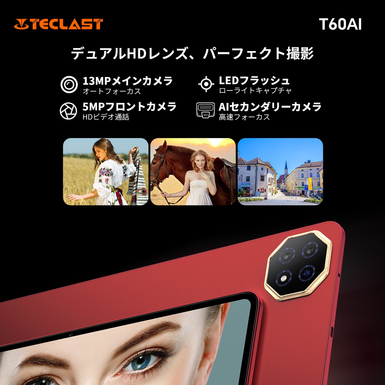 T60AIは、オ一トフォ一カスとAIセカンダリ一レンズを搭載した13MPリアカメラで、より高速なフオ一カシングと撮影を実現し、一瞬一瞬を鮮明に捉えます。暗い場所での撮影に便利なLEDフラッシュと5MPのフロントカメラで、ビデオ通話もよりスム一ズでクリアに。
