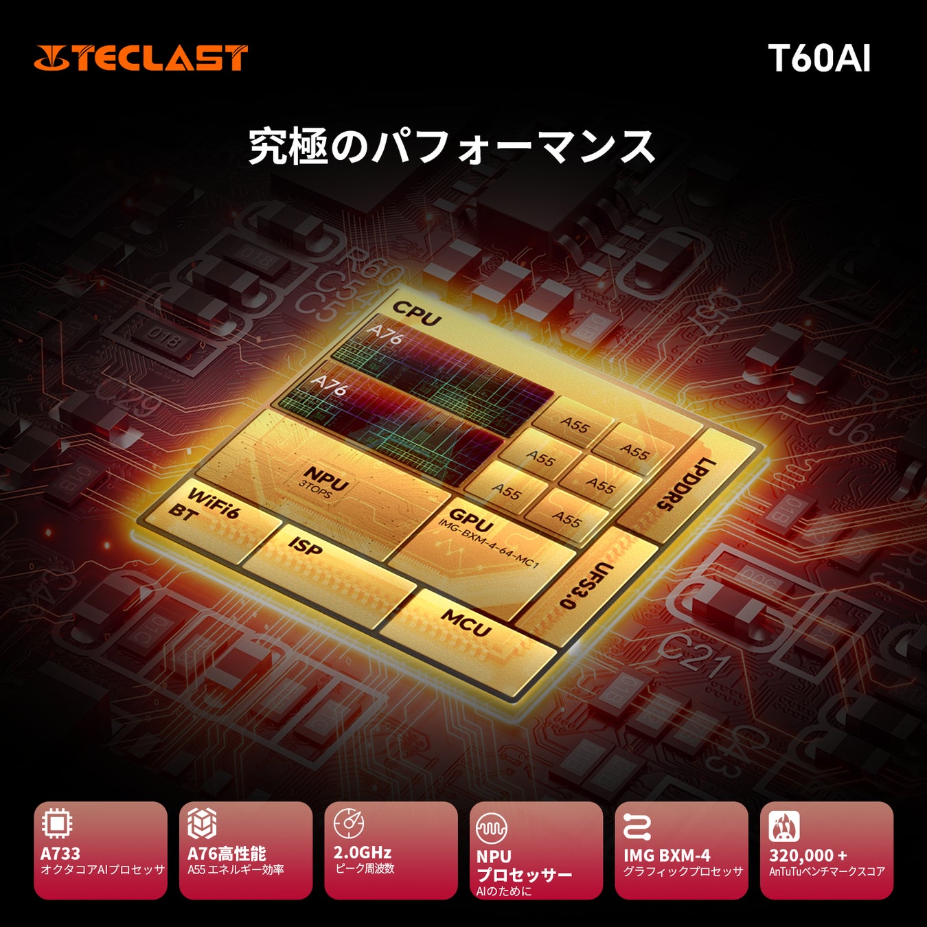 Allwinner A733オクタコアAIプロセッサーを搭載したTeclast T60AIは、AnTuTuベンチマークで320000以上のスコアでエリートレベルのパフォーマンスを実現します。A76高性能コアとA55高効率コアに加え、AIタスク用の3TOPS NPUを搭載し、すべてのアプリケーションでスムーズで応答性の高いインテリジェントな動作を保証します。