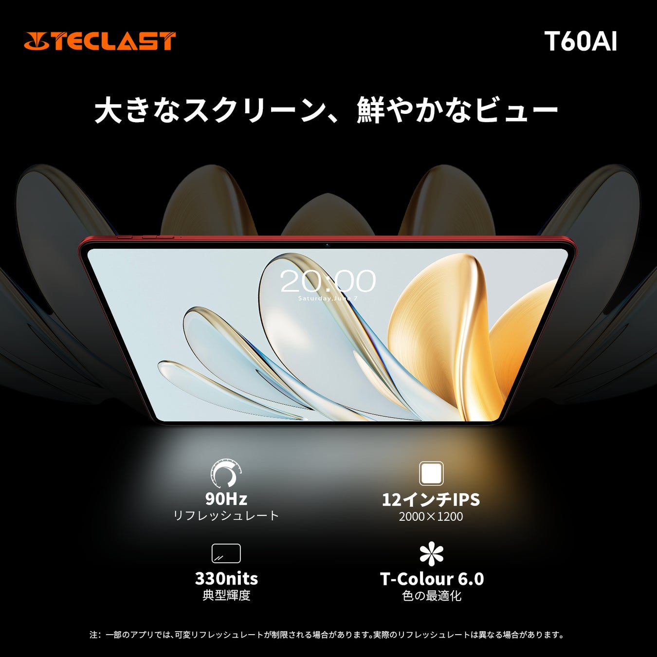 T60AIは、12インチのIPSスクリーンおよび90Hzの可変リフレッシュレートと330nitsの標準輝度を備えています。環境光センサーにより、画面の明るさを自動的に調整します。AI を搭載し、最新アップグレードされたT-Colour 6.0最適化テクノロジーで、ディスプレイのパフォーマンスをさらに向上させ、より豊かな視覚体験を提供します。