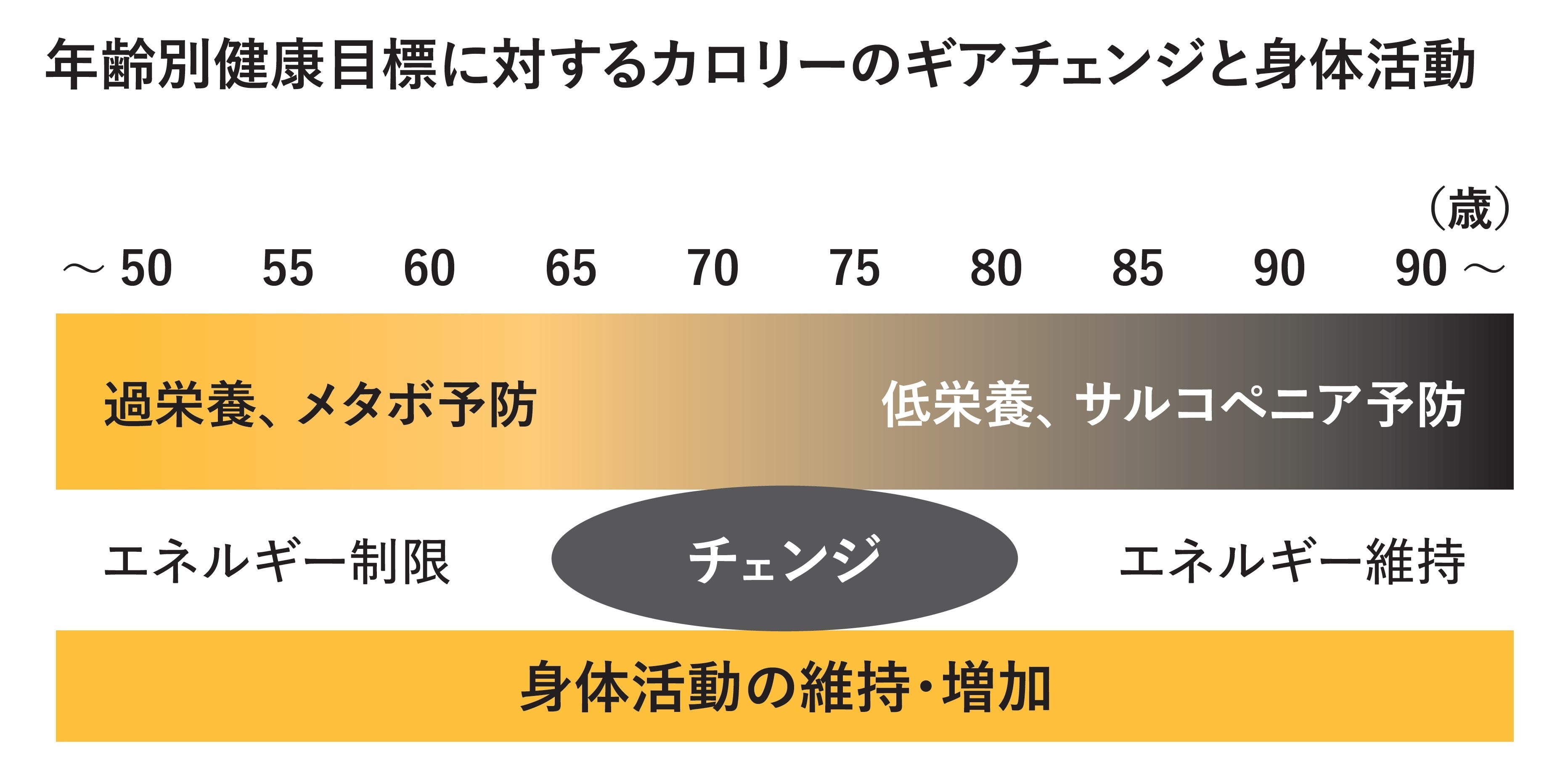 中年時代にはもっと食事を減らすことが健康につながっていたのが、人生のどこかでそれが逆に栄養素の量(食事の質)を増やすことが健康につながるという、難しい課題が出てしまうのです。多くの高齢の人は自然に食事を食べる量が減っていき、それに伴って痩せていくことでサルコペニアになりやすくなります。とくにメタボ対策で食べすぎを注意されていた人は食事量が減って痩せてよかったと思っていたら筋肉ばかり減り、脂肪はそのままになってしまう「サルコペニア肥満」というメタボとサルコの両方とも合わさった状態となってしまいます。この「サルコペニア肥満」はサルコ単独と比べてより不健康であることが報告されているため、できるだけ避けたい状態です。