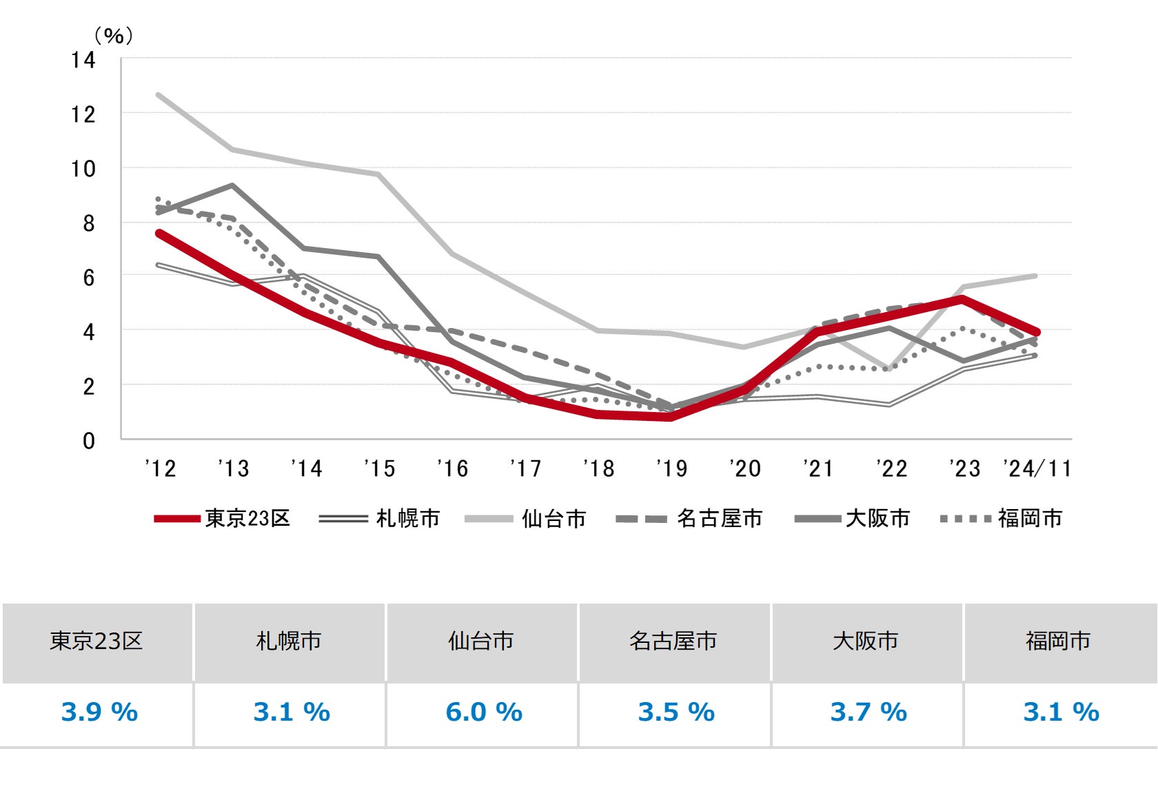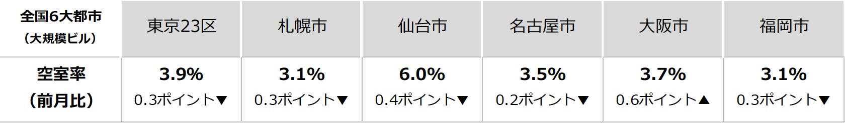 三幸エステート株式会社(本社:東京都中央区、取締役社長:武井重夫)は、2024年11月度の東京都心5区(千代田区、中央区、港区、新宿区、渋谷区)および全国6大都市(東京、札幌、仙台、名古屋、大阪、福岡)の大規模ビル※1のマーケットデータをまとめた「オフィスマーケット2024年12月号」を公表します。