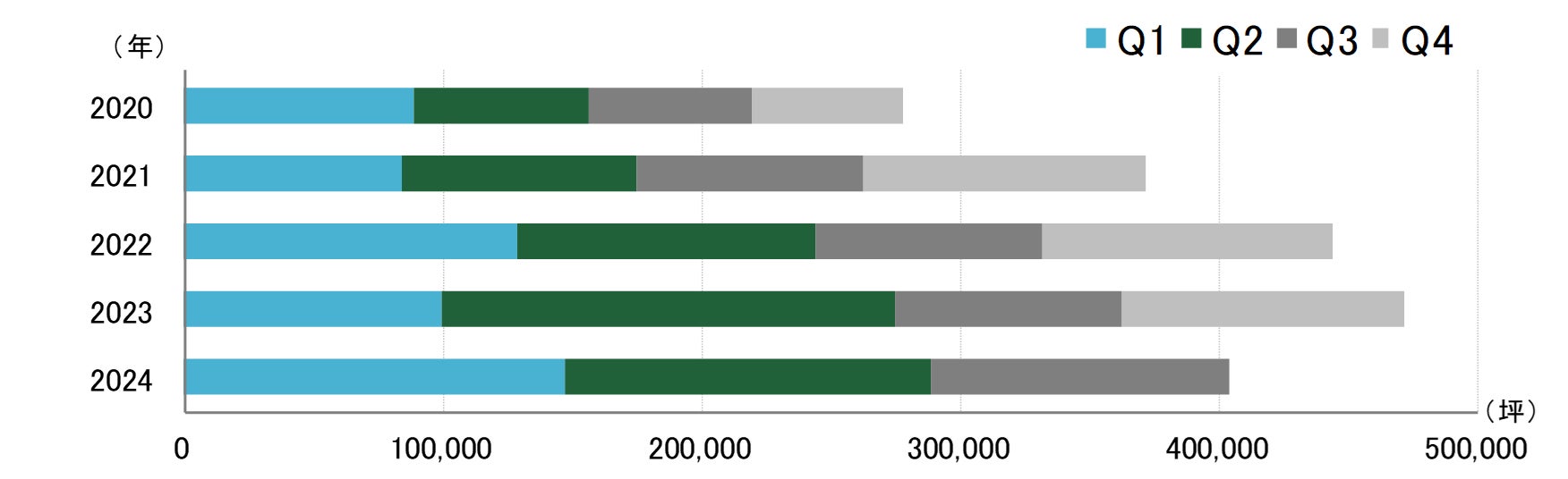2024年第3四半期の成約面積は対前年同期比でプラスとなった。第1~第3四半期の合計でも前年同期を上回り、オフィス需要の拡大傾向が継続している。テナントの移転に向けた動きは活発で、2024年の年間成約面積も前年を上回る可能性が高い。
