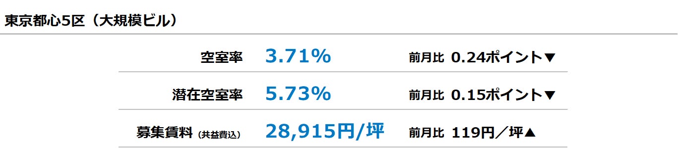 空室率は前月比マイナス0.24ポイントの3.71%となり、3ヵ月連続での低下となった。拡張移転や館内増床により比較的まとまった面積の空室が消化されている。潜在空室率は前月比マイナス0.15ポイントの5.73%となった。低水準の新規供給を背景に、空室率・潜在空室率ともに緩やかな低下傾向にある。
