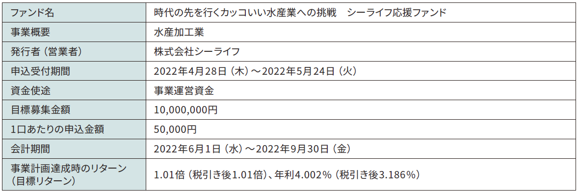 ソニー銀行株式会社(代表取締役社長:南 啓二/本社:東京都千代田区/以下 ソニー銀行)は、投資型クラウドファンディングのプラットフォーム「Sony Bank GATE」において、2022年4月28日(木)より、株式会社シーライフを営業者として、出資の募集の取り扱いを開始しますのでお知らせいたします。