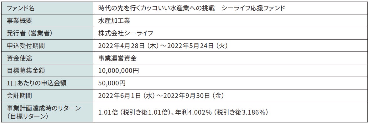 Sony Bank GATE では、当事業を含む事業運営への出資を1口50,000円、目標募集金額10,000,000円で募集します。