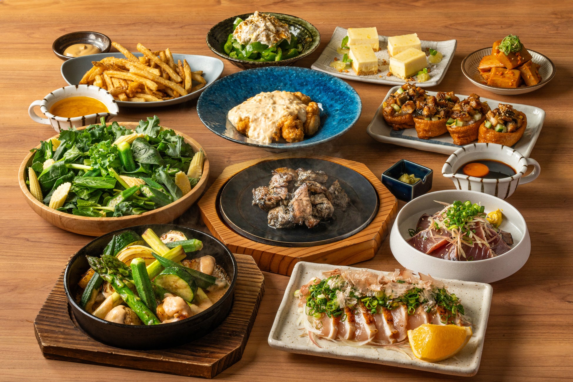 名物「地鶏の炭火焼」や「国産若鶏チキン南蛮」を中心に、季節野菜の明太チーズフォンデュ、初夏のNOJOサラダ、宮崎県産の鰻を使った季節の彩いなりや瀬戸内レモンチーズケーキなど〆はもちろんのこと、デザートまでご満足いただける季節限定コースです。