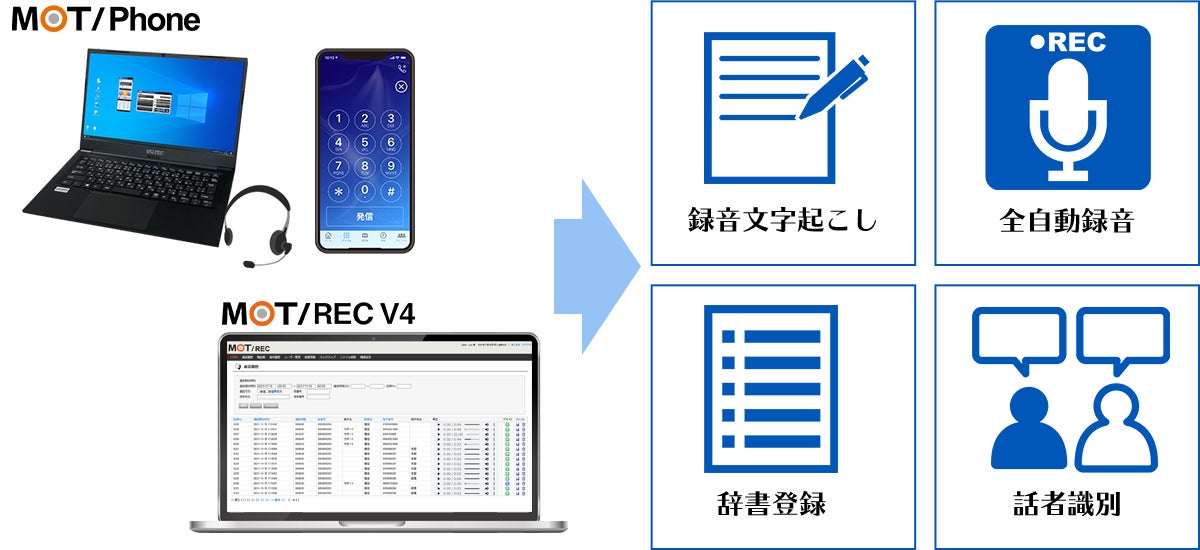 ビジネスフォンアプリ「MOT/Phone」によりスマートフォンの内線化+会社番号発信・着信+通話録音+自動文字起こしが可能になります。