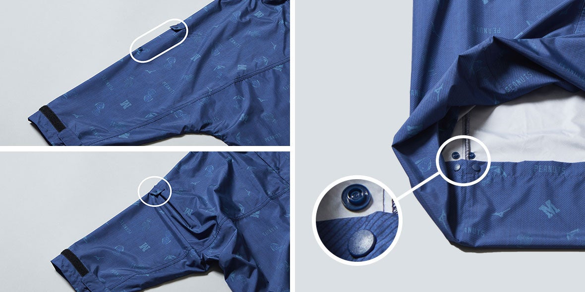 「Compactウォーターリパレント」シリーズは、撥水・防風・コンパクトが特長のフード付きコートです。メンズ・ウィメンズ・ジュニアをラインナップし、親子でのコーディネートも楽しむことができます。ジュニアは丈と袖部分にドットボタンがついているので、成長に合わせて長く使うことができます。また、左胸には再帰反射のオリジナルロゴ、背中側には再帰反射パイピングを施しているので暗い場所での安全性にも配慮をしています。デザインはすべて、スヌーピー・ウッドストック・サボテンのイラストと、ミズノのロゴが入った総柄デザインです。