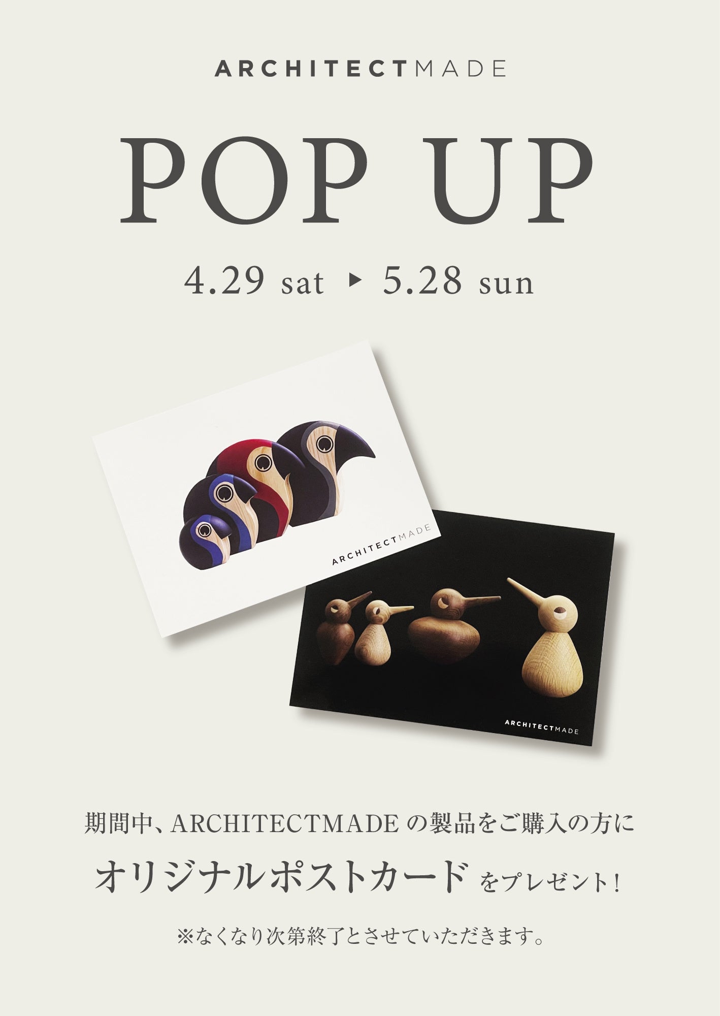 開催内容:期間中、対象店舗にてARCHITECTMADEの製品を多数展開します。さらにARCHITECTMADE製品をご購入の方に先着でオリジナルポストカードをプレゼント。※無くなり次第終了します。