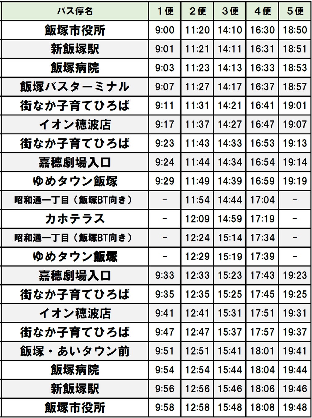 当路線は7/26に新たに開業した「ゆめタウン飯塚」や既存の「イオン穂波店」「カホテラス」「飯塚市中心商店街」など4つの商業施設、また「JR新飯塚駅」や「飯塚バスターミナル」のほか、「飯塚市役所」や「街なか子育てひろば」等の公共施設を結ぶことでお客さまの利便性を向上させ、地域活性化につなげていきたいと考えます。