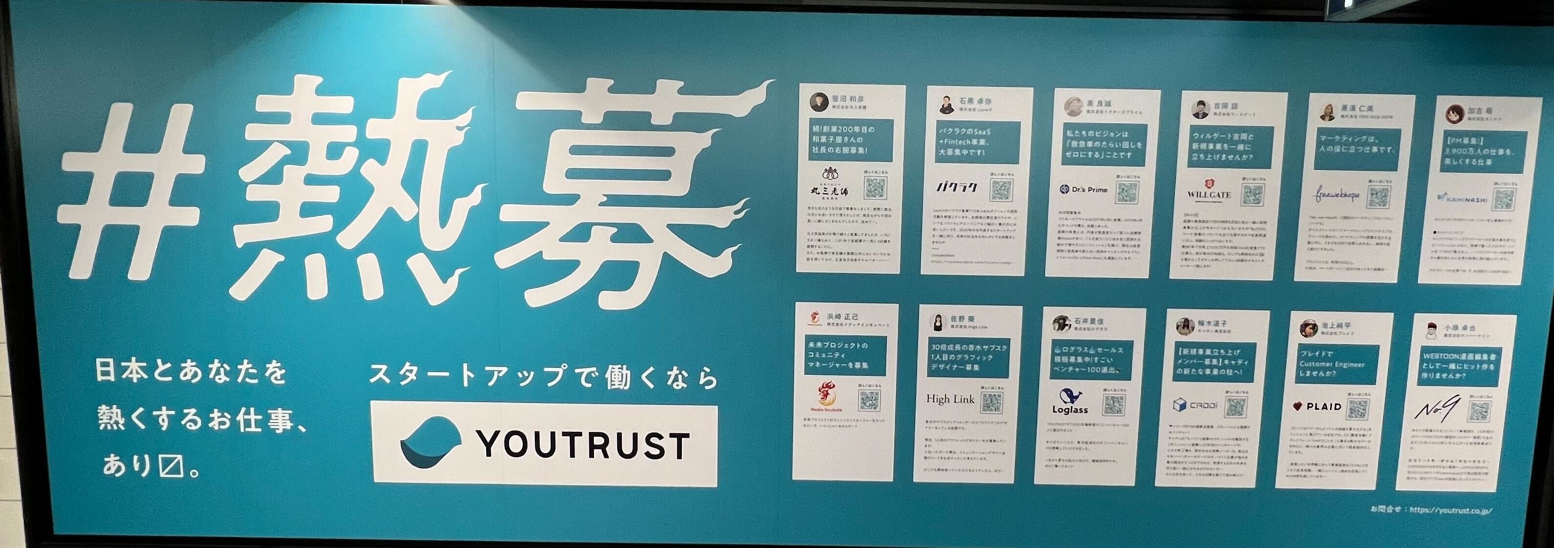 これまでに多くの方にご支援をいただいてきた未来プロジェクトですが、今回、「YOUTRUST内の募集投稿」が屋外広告として掲載(https://youtrust.jp/posts/d81764007b9eee3c7d47efb4c18e68e6)いただきました。