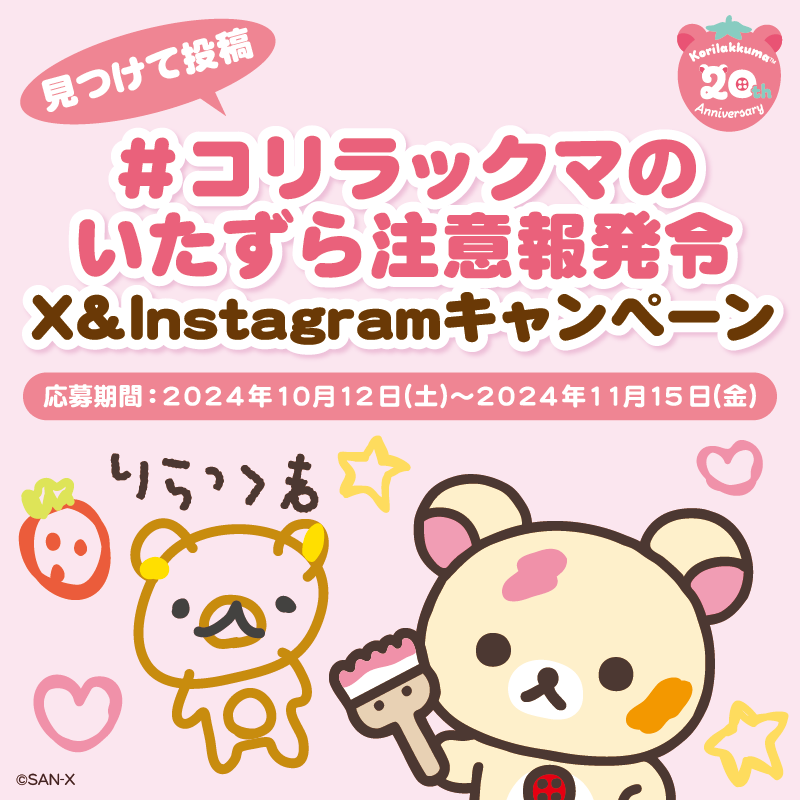 対象店舗・会場でコリラックマがいたずらをしているイラストパネルを探して撮影し、写真とハッシュタグ「#コリラックマのいたずら注意報」をつけて、SNS(XまたはInstagramアカウント)投稿すると、抽選で5名様に「コリラックマグッズ詰め合わせ」が当たるキャンペーンを実施しています。