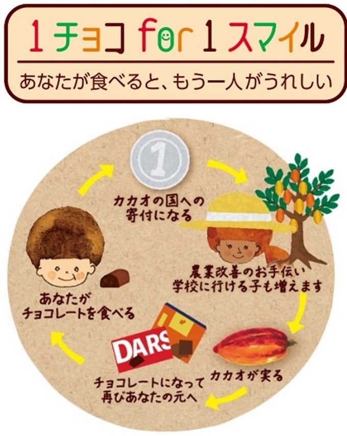 2008年に創業110年を記念し、カカオ生産国の子どもたちを支援する「1チョコ for1スマイル」を開始しました。