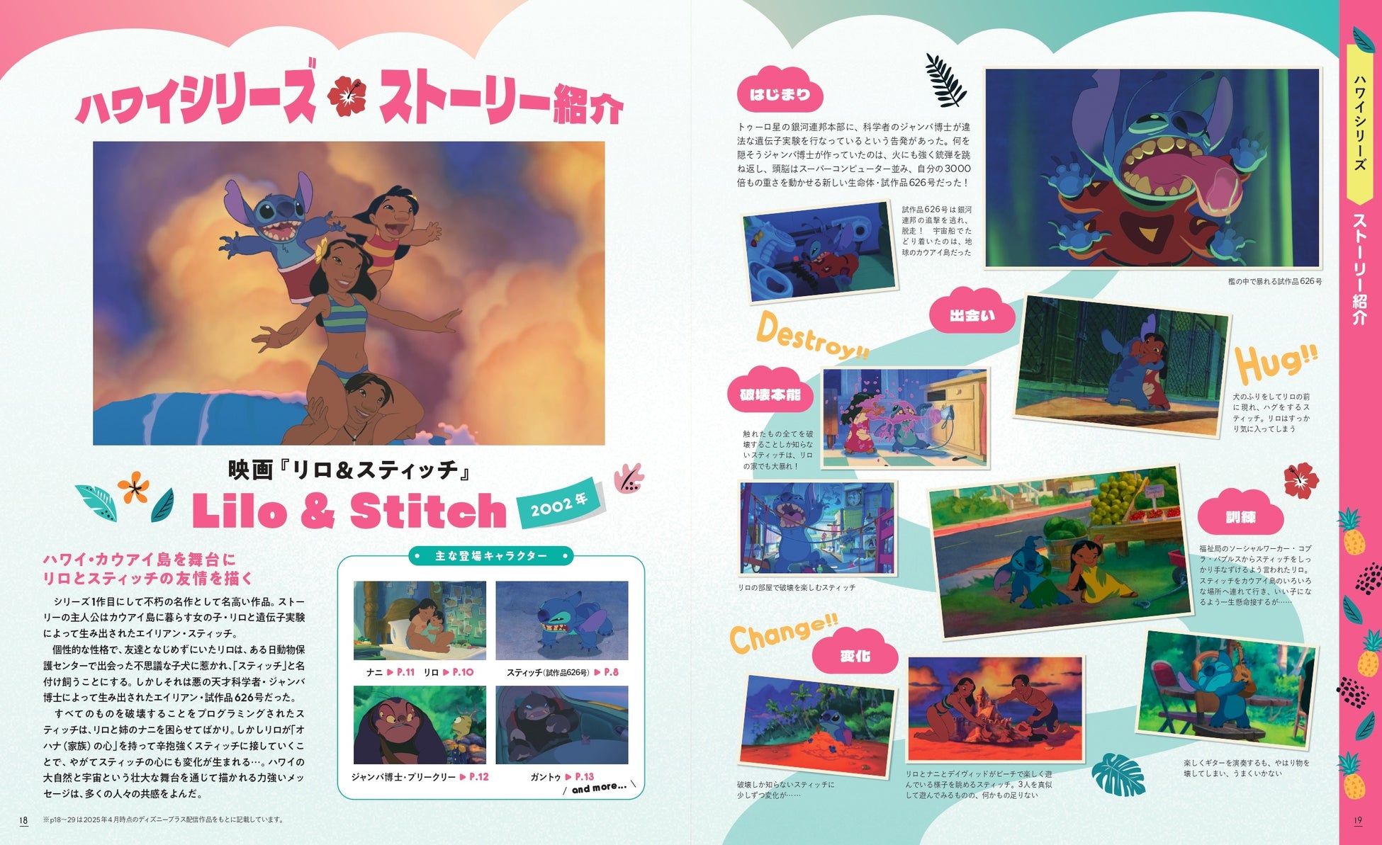 映画『リロ&スティッチ』をはじめとするハワイシリーズ、TVアニメの沖縄編シリーズ、それぞれのキャラクターとストーリーをシーン画像満載でガイド。ハワイシリーズのモデルとされているカウアイ島・ハナペペの街、ハワイ3島のおすすめ1dayプラン、沖縄シリーズの舞台のモデルとされている竹富島も紹介しています。